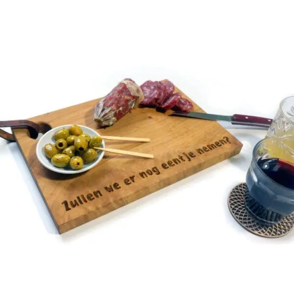 Ieder stuk hout is net anders en daarom altijd uniek. Maak de borrelplank nog unieker met een eigen tekst; een perfect persoonlijk cadeau.