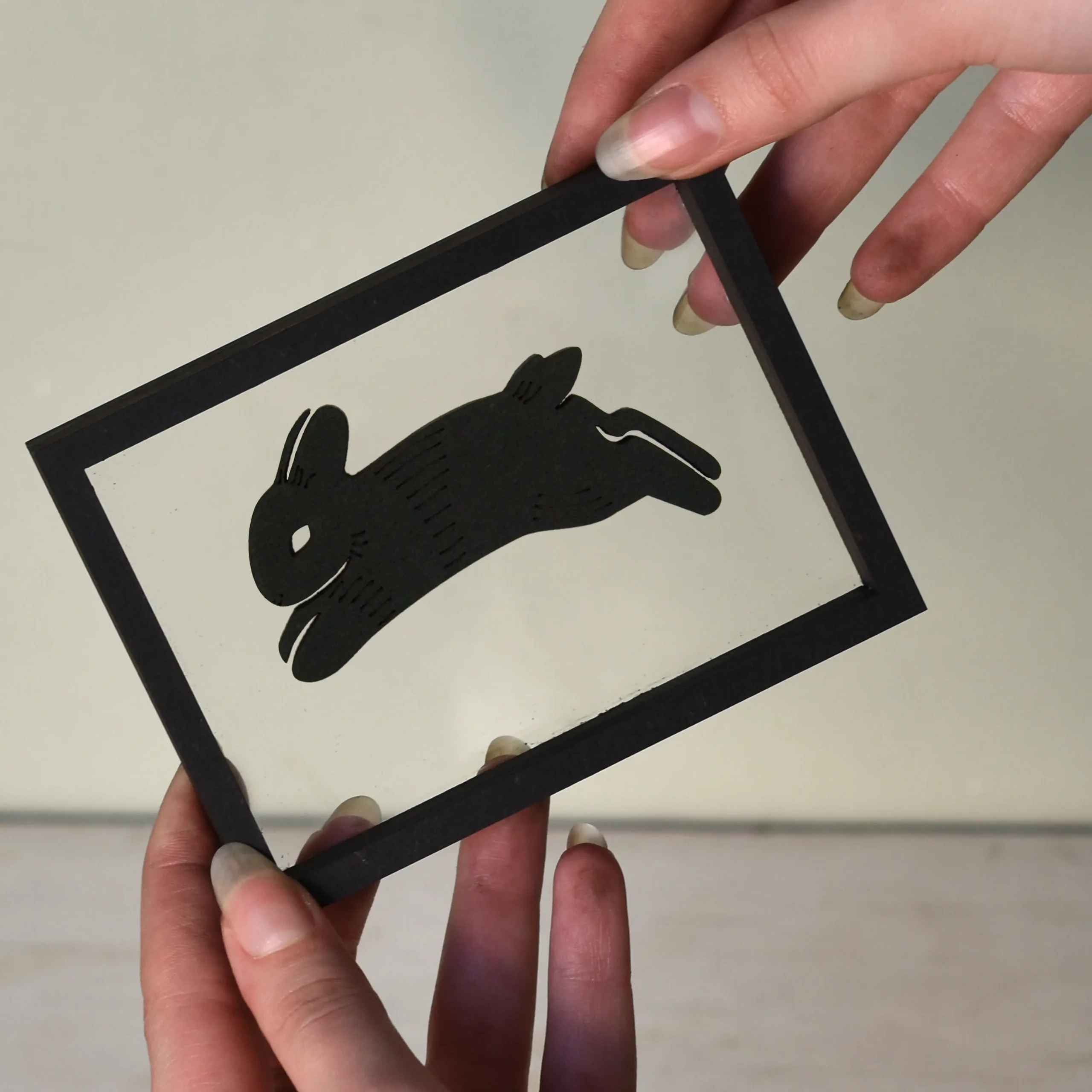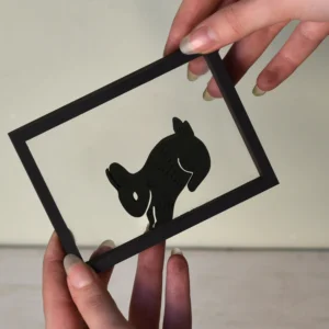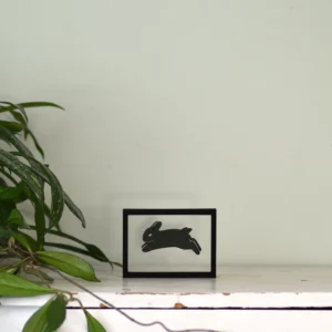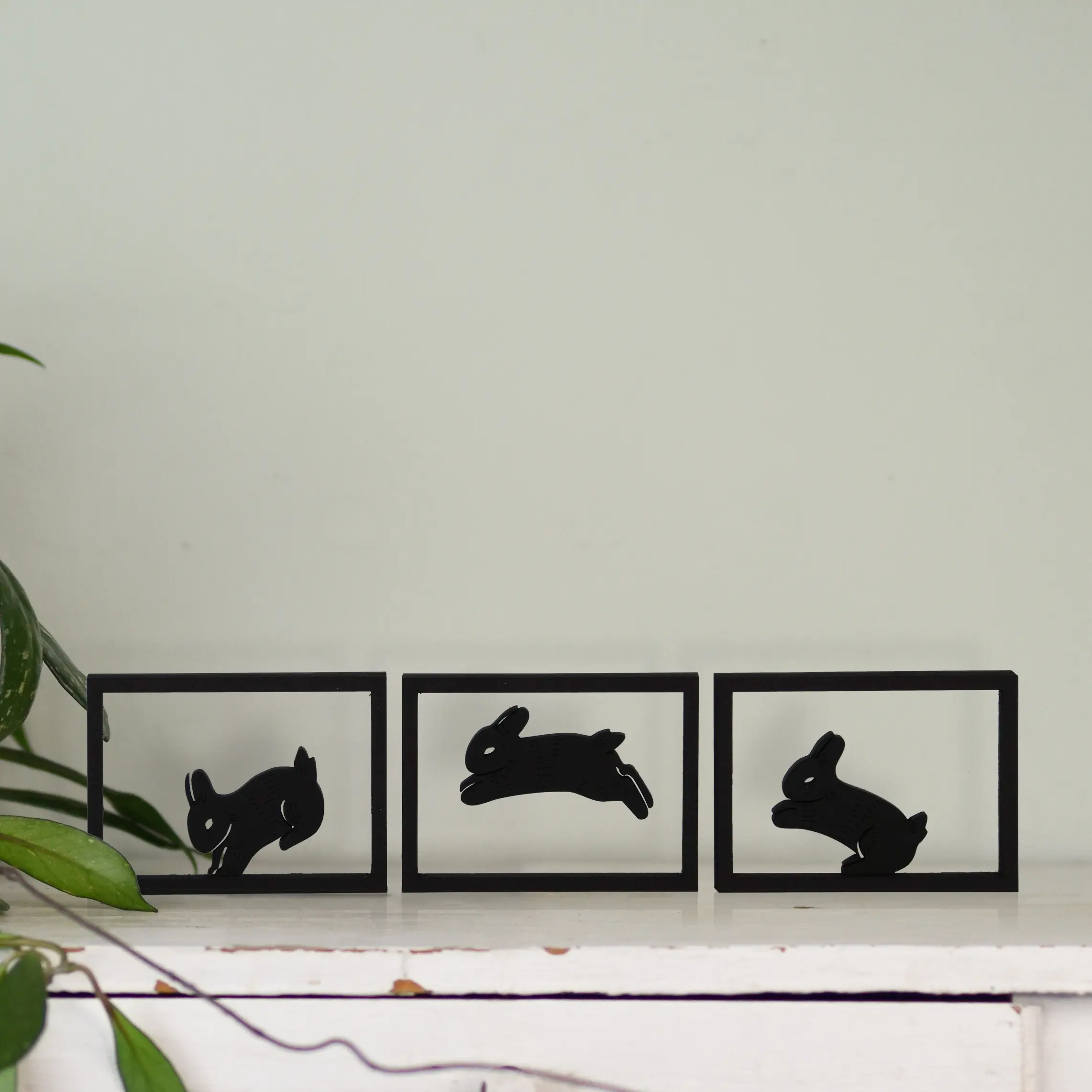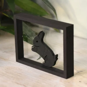 Zoek je een manier om speelsheid in je interieur te brengen op een stijlvolle manier? Dat kan met onze houten floating frames ‘Springende Konijntjes’. De frames laten silhouetten van drie konijntjes zien in één vloeiende sprong: één dat net afzet, één in de lucht en één dat landt. Samen vormen ze een levendig moment dat energie brengt.