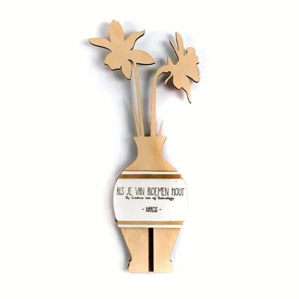 De vaasjes worden met de laser gesneden uit berkenhout en worden plat verpakt. Ze kunnen gemakkelijk in elkaar worden geschoven.