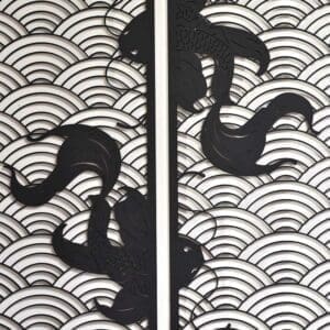 Die ‚Koi Waves 2.0‘ Wanddekoration ist aus hochwertigem schwarzem MDF gefertigt. Das Holz ist durchgehend schwarz und weist noch einige Fasern auf, was ihm ein natürliches und stilvolles Aussehen verleiht.